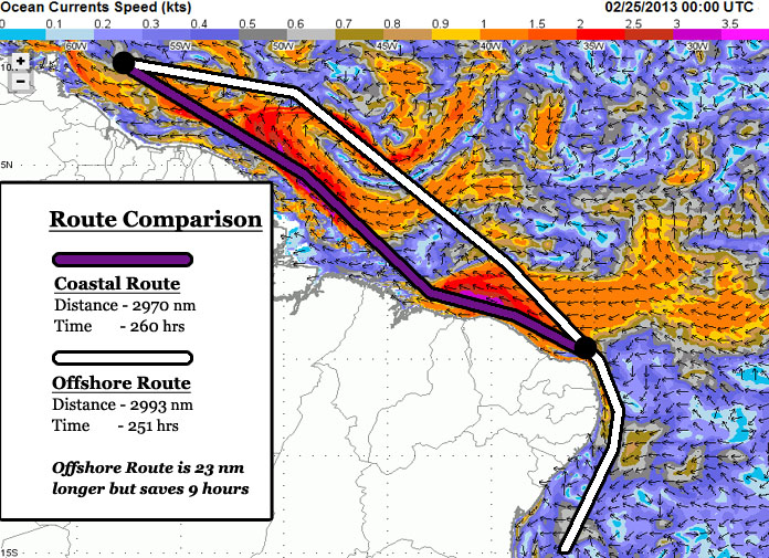 In the recent past, satellite measurements have resulted in a leap forward in the understanding and prediction of ocean currents in the scientific community. For example, in 2008 scientists announced the discovery of a previously unknown current pattern called the North Pacific Gyre Oscillation, which answered long standing questions regarding changes in salinity and chlorophyll that have been observed over the Northeast Pacific. These same satellite measurements have also contributed to the development of the Hybrid Coordinate Ocean Model (HYCOM) and the Real-Time Ocean Forecast System (RTOFS) by a collaboration of scientists at Florida State University, NOAA, and the U.S. Navy. These models produce both an analysis and an accurate ocean current forecast covering nearly the entire globe that can be used in a variety of applications ranging from hydrographic and biological research to efficient ship routing. WRI provides RTOFS and HYCOM data to our clients through our Dolphin Fleet Management website (www.wridolphin.com) and Dolphin Voyage Planner, and in our detailed forecast advisories. Dolphin users can simply adjust the charts to any location at any zoom level with our dynamic "zoomable" map interface, with your ships current and future positions plotted on the charts. WRI ingests the full RTOFS ocean current forecasts into our system, and always take this data into account when analyzing and recommending routes for ships worldwide. Figure #3 demonstrates the importance of ocean currents with regards to efficient ship routing. Ship captains often prefer a shorter more coastal route toward Cabo de São Roque from Galleons Passage, however significant time savings can be gained when following an offshore route and avoiding strong the adverse Guiana Current. A more coastal route would be preferred for northbound vessels in order to benefit from a strong following current. We also ingest RTOFS current data into our high resolution wave model, in combination with high resolution wind forecasts from the WRF-ARW model. This produces highly accurate wave height forecasts in areas where strong semi-permanent ocean currents meet opposite swell, locally amplifying the waves. These areas are also known to be particularly favorable for rogue waves, and can be dangerous for small or sensitive vessels.