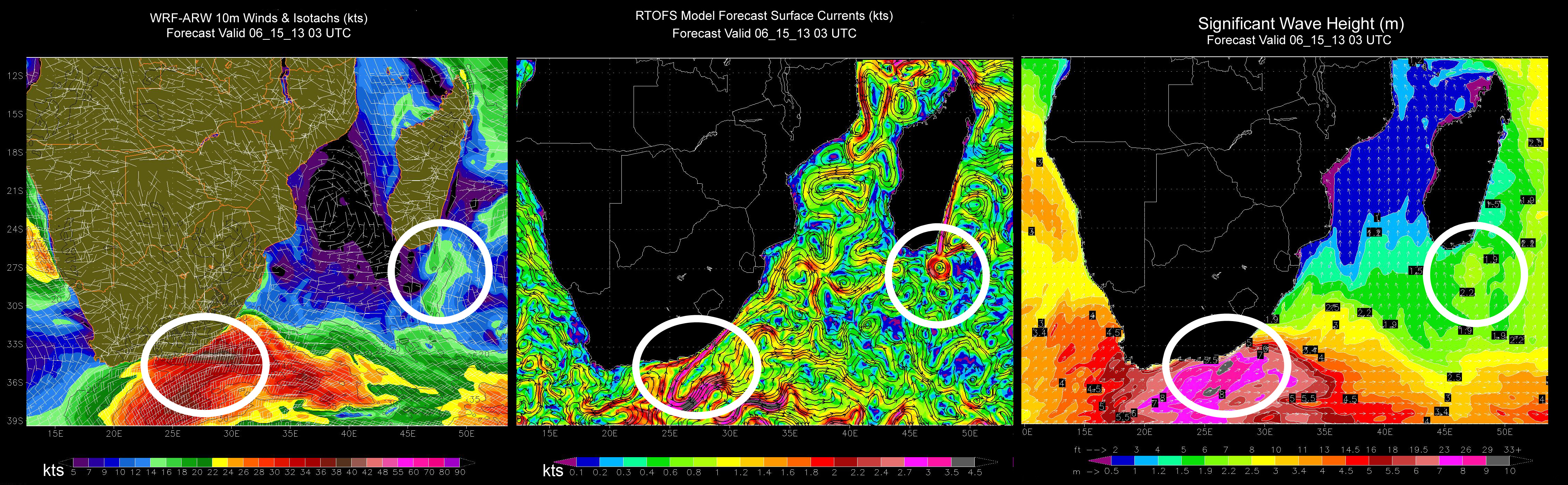 Figure #4 - WRF-ARW winds, RTOFS currents, and the resulting model forecast significant wave height.
