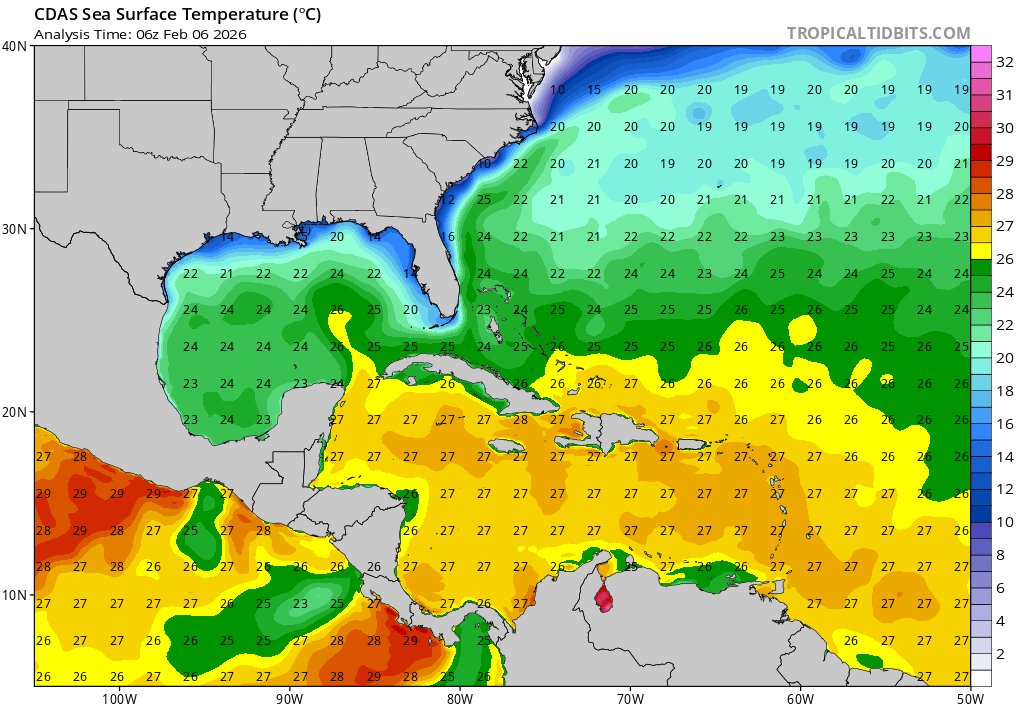 Figure 2: Current sea surface temperatures (SSTs) across the Western Atlantic. Image courtesy of TropicalTidbits.com