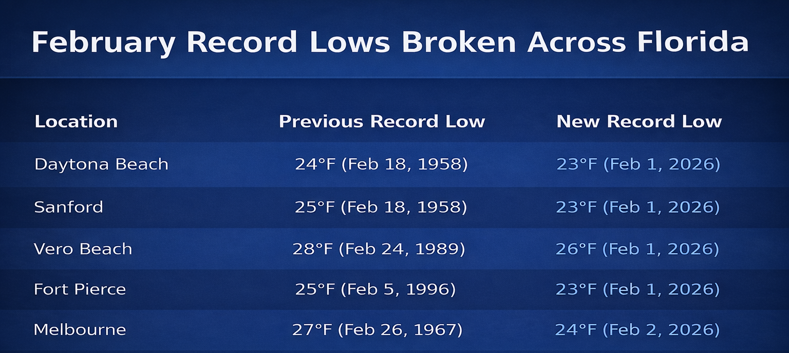 Figure 1: Record breaking low temperatures across central Florida between February 01st and 02nd.